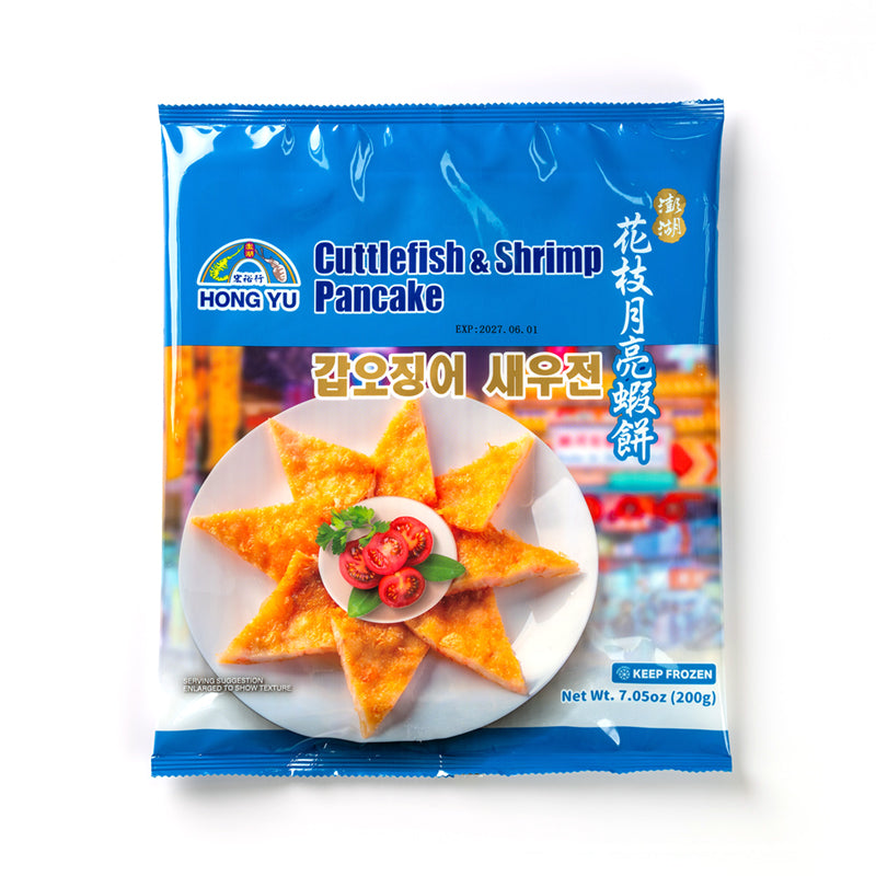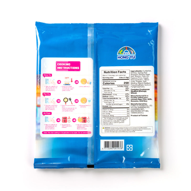 使用高檔蝦仁搭配澎湖花枝,在以不同手法呈現,創造出本公司最具有異國風味產品。外皮利用糯米紙包覆住,使酥脆感較為顯著,內餡搭配鮮甜花枝和鮮脆蝦仁,口感香脆,清爽不油膩。